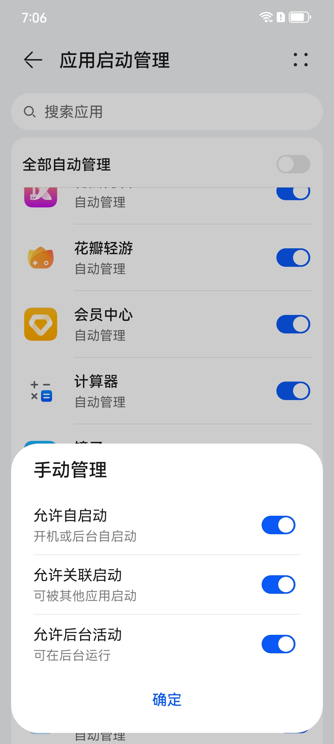 进入之后,再点击【应用启动管理】,进去之后找到【快鸭】旁边的按钮点击一下,会弹出以下的界面,全部点开启(如图所示)。