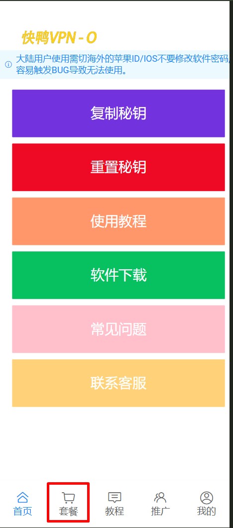 登录成功之后,会看到下图的界面,底部有个【套餐】的按钮,点击就可以购买会员了。